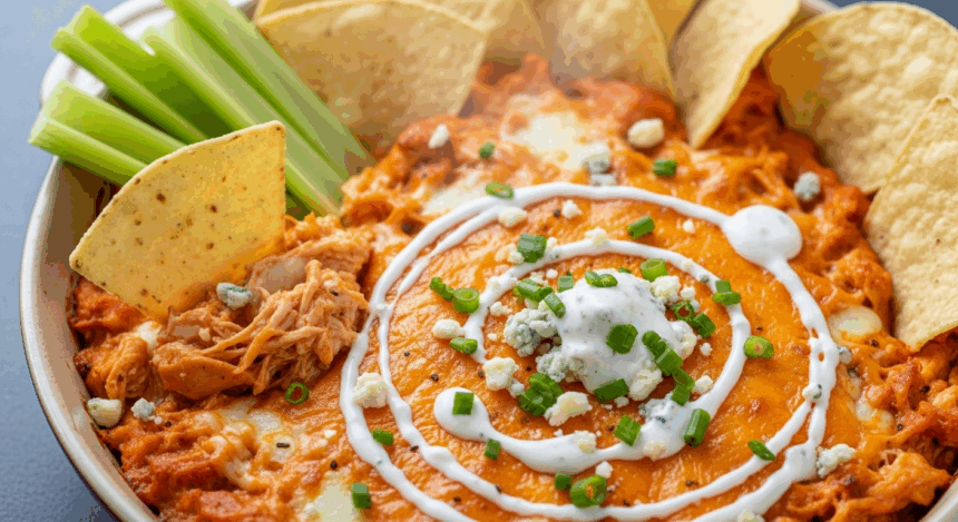 A: Not at all. This dip is surprisingly simple: shredded cooked chicken, cream cheese, Buffalo wing sauce, ranch or blue cheese dressing, and shredded cheese come together in one dish. Pop it in the oven or microwave until bubbly and golden, and you’ve got a spectacular snack ready fast.