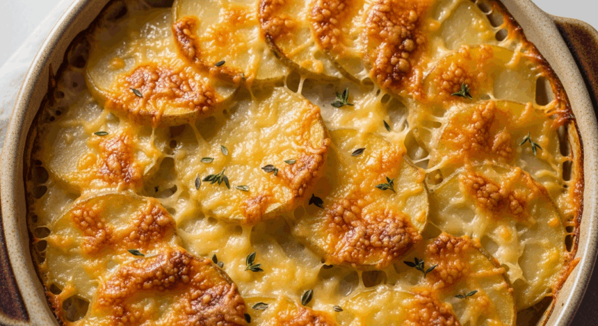 Decadent creamy scalloped potatoes with golden brown crust and fresh thyme garnish