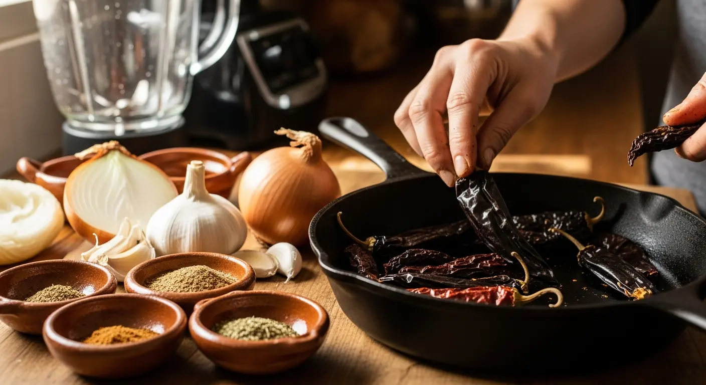 - Toast the chilies: In a dry skillet over medium heat, toast the guajillo and ancho chilies briefly until fragrant and pliable, about 1-2 minutes per side. Be careful not to burn them; this step deepens flavor by releasing essential oils.