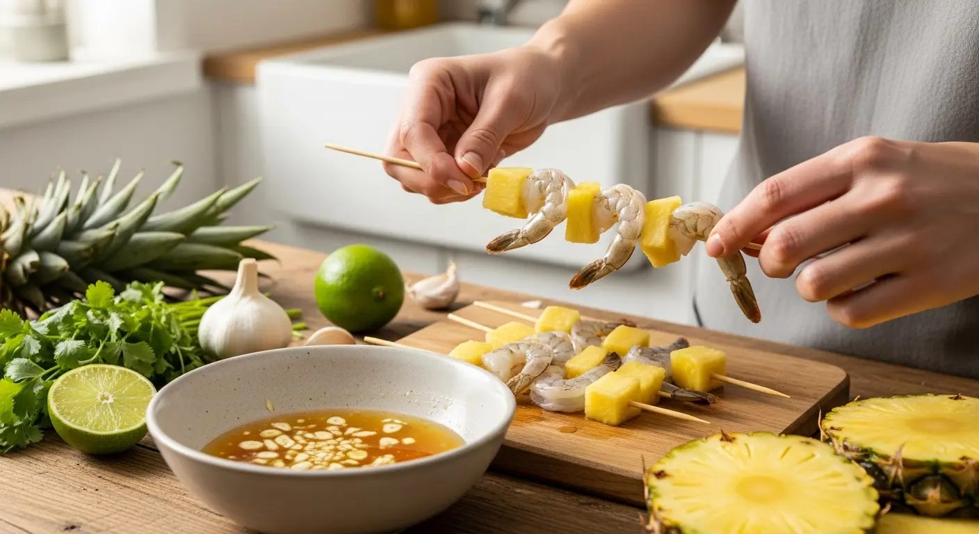 4. Assemble the skewers: Thread shrimp and pineapple alternately onto skewers, leaving a little space between each piece to ensure even cooking and caramelization.