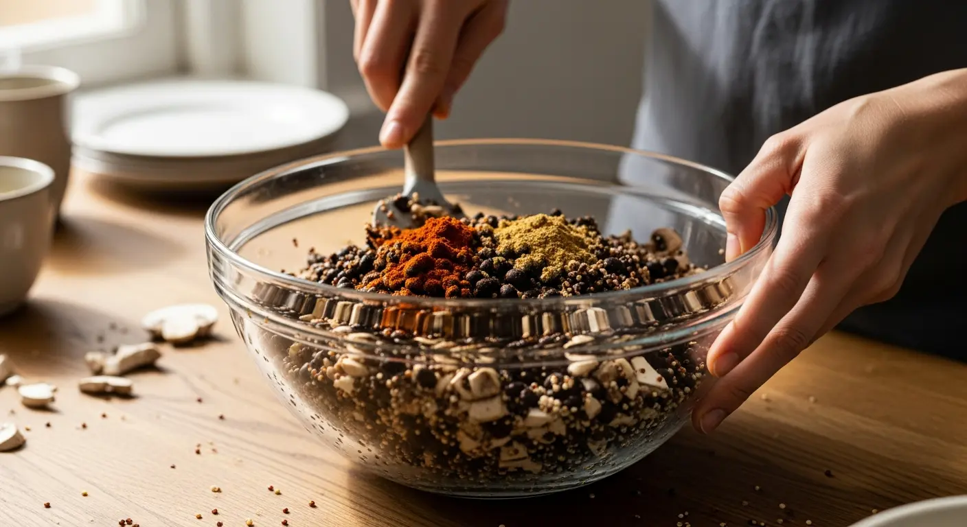 4. Combine ingredients: Add cooked mushrooms mixture, quinoa, flax egg, soy sauce, smoked​ paprika, cumin, nutritional yeast, breadcrumbs, salt, and ‍pepper to⁤ black beans.⁣ Mix​ thoroughly until the mixture⁤ holds⁤ together but remains ‍slightly moist.