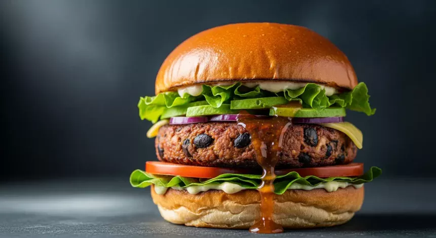 Savory mushroom & black ​bean burgers stacked ​with fresh toppings